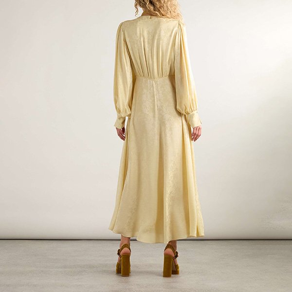 The dress features a meticulously tailored silhouette, accentuated by a seamed waist that effortlessly flatters your figure. Puffed shoulders add a touch of vintage charm, while the nearly knuckle-grazing cuffs, thoughtfully split for comfort, drape gracefully over your hands, enhancing your every movement with an air of refined grace.