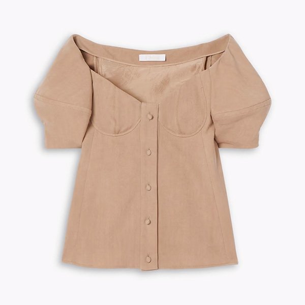 The neutral (ad) hue serves as a versatile canvas, allowing for effortless pairing with your favorite pieces, while the alluring off-the-shoulder design delicately showcases your collarbones, exuding a timeless femininity. The meticulously crafted button fastenings through the front add a touch of refined detail, inviting a subtle playfulness to this otherwise classic silhouette.