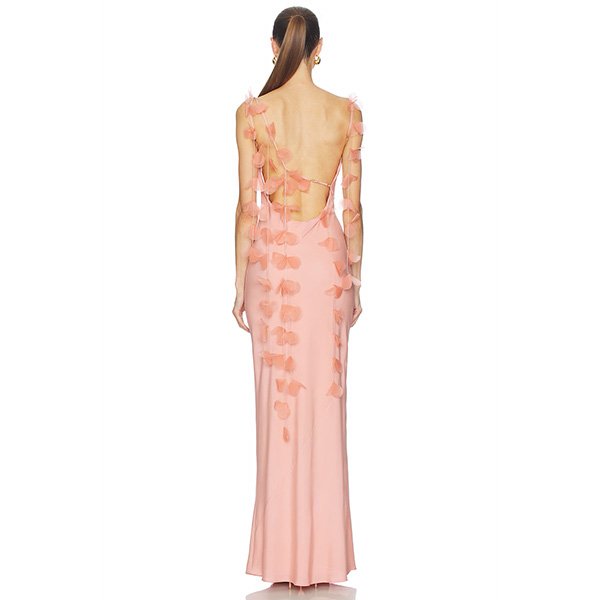 Step into a realm of ethereal beauty with the Cult Gaia Nymeria Gown in a breathtaking petal pink hue. This exquisite gown transcends the ordinary, enveloping you in luxurious silk and featuring delicate organza flower petals that cascade gracefully down the silhouette, capturing the light with every movement.
