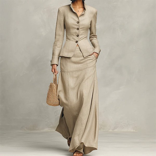 Made from a premium blend of 83% polyester, 13% linen, and 4% spandex, this jacket offers an exquisite touch against the skin, ensuring maximum comfort without compromising on elegance. The fully lined interior, composed of 100% polyester, enhances the luxurious feel while providing an effortless drape.
