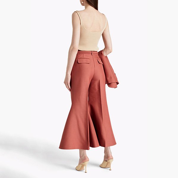 The flared design adds an element of drama and sophistication, creating a beautifully elongated leg line. Pressed creases run down the front, lending an air of refinement that is ideal for both day and evening wear. The detachable chain-trimmed belt not only provides a customizable fit but also adds a touch of opulence, ensuring you stand out in every setting.